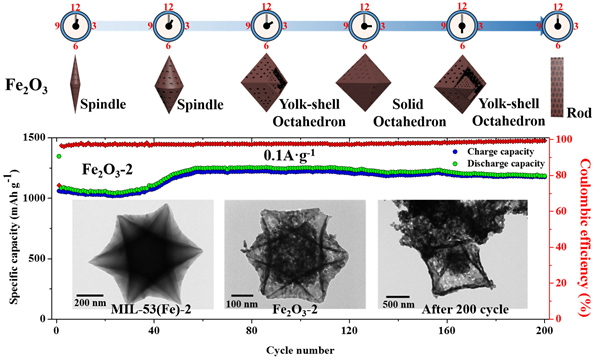 近日,环化学院王勇教授课题组的最新能源电池材料研究成果 “Microwave-Assisted Morphology Evolution of Fe-Based Metal-Organic Frameworks and Their Derived Fe2O3 Nanostructures for Li-Ion Storage”发表于美国化学会下期刊ACS Nano(2017,11,4198;影响因子:13.334),详见http://pubs.acs.org/doi/abs/10.1021/acsnano.7b01152。该研究是通过微波辅助调节金属有机骨架前驱体的形貌,设计获得纺锤形、凹面八面体、正八面体、核壳八面体结构等不同形貌的多孔氧化铁电极材料。在电化学储能应用中,核壳八面体结构的多孔氧化铁材料展现出优异的储锂性能,在循环200圈后的储锂容量仍高达1176 mAh/g,同时也具有优秀的倍率性能。