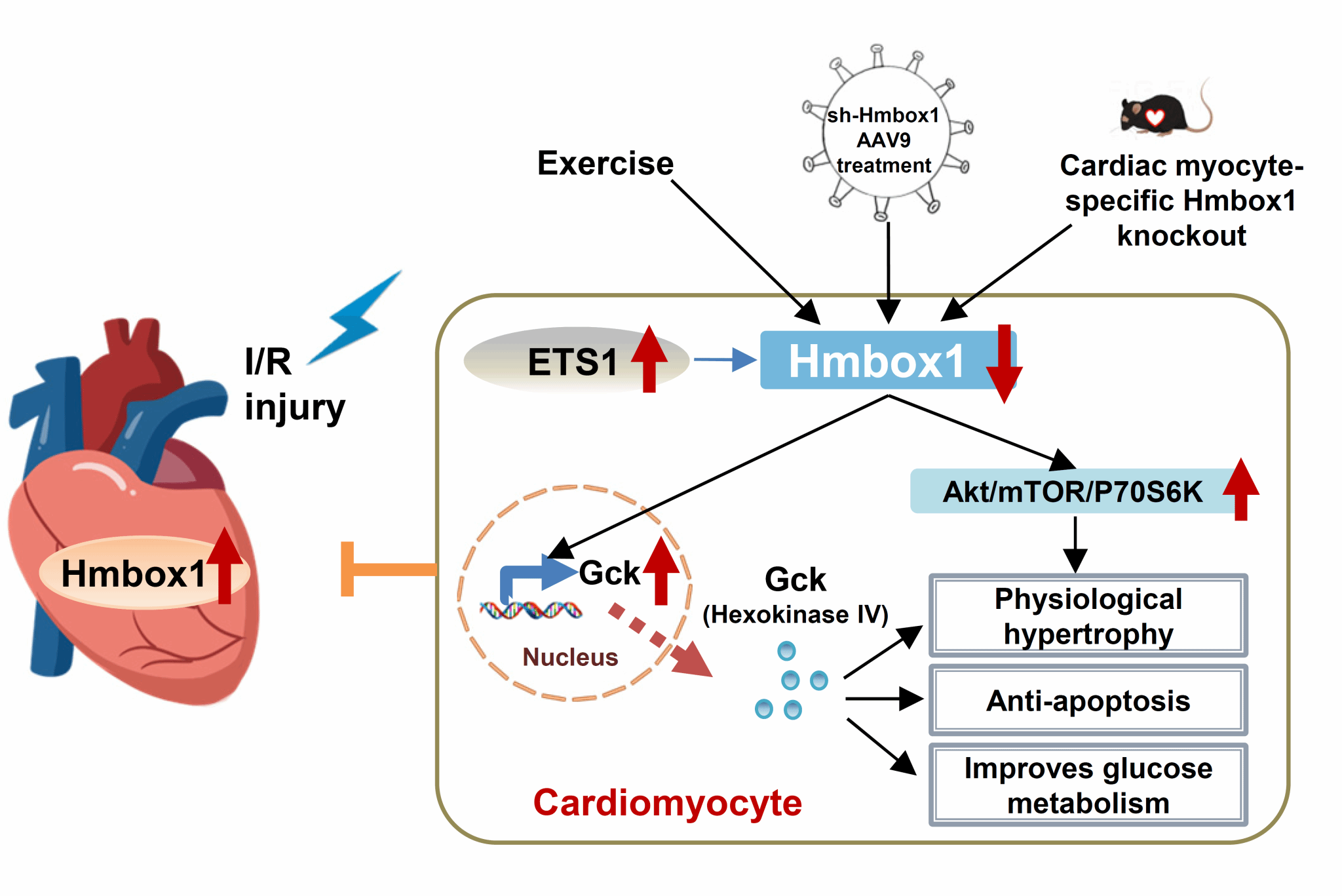 图:抑制Hmbox1参与介导运动诱导的生理性心肌肥厚,通过改善心肌细胞存活和葡萄糖代谢保护心脏抵抗缺血/再灌注损伤。