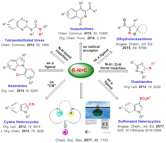 近年来,许斌教授团队在惰性键活化和异腈化学领域取得了多项研究成果,系统地研究了金属催化下异腈参与的含氮杂环合成。从异腈化合物出发,系统地研究了基于异腈的新颖的氰基化反应、C-H/N-H/O-H键的插入反应、自由基串联关环反应、以及异腈在反应中作为关键配体参与的反应,构建了异喹啉、氮杂吲哚、胺基噁二唑、芳基吡啶、芳基嘧啶、多取代脲等一系列的含氮杂环化合物。最近,应邀就异腈参与的碳-氢键官能团化反应方面的最新研究进展进行了综述,这部分工作已发表在国际顶尖的《化学会评论》上,并被推荐为封面文章(参见:Chem. Soc. Rev. 2017, 46, 1103-1123)。