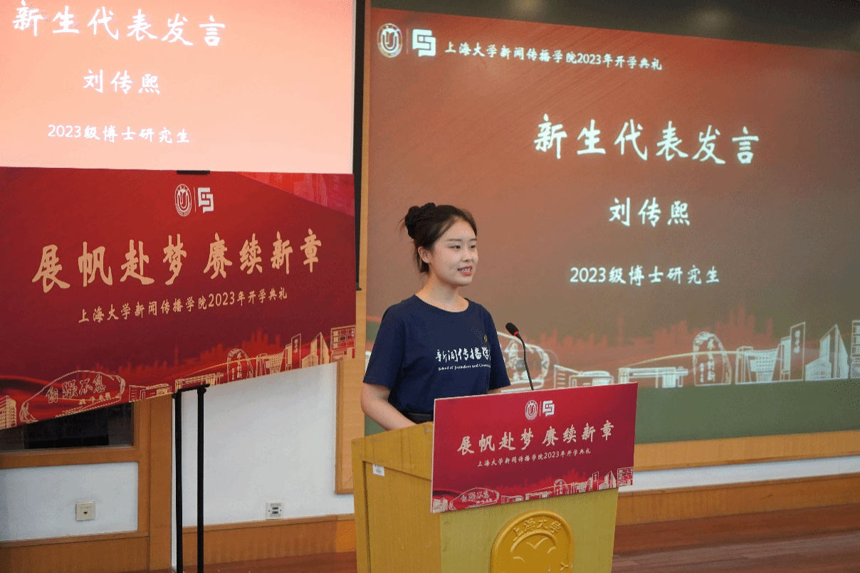 出席此次开学典礼的有新闻传播学院党委书记王晴川,学院党委副书记、院长严三九,学院党委副书记、副院长王智君,副院长赵为学,副院长牛盼强,上海研究院世界传媒研究中心执行主任吴信训教授,新闻传播系张咏华教授,广告学系查灿长教授,智能传播系负责人王虎,智能视听系支部书记刘峰,智能视听系负责人虞国芳,以及专业教师代表、班主任、辅导员、行政老师等,一起见证了新生入学这一重要时刻。本次开学典礼由2023级新闻与传播硕士研究生于昊岑与2022级广播电视学本科生肖芸主持。