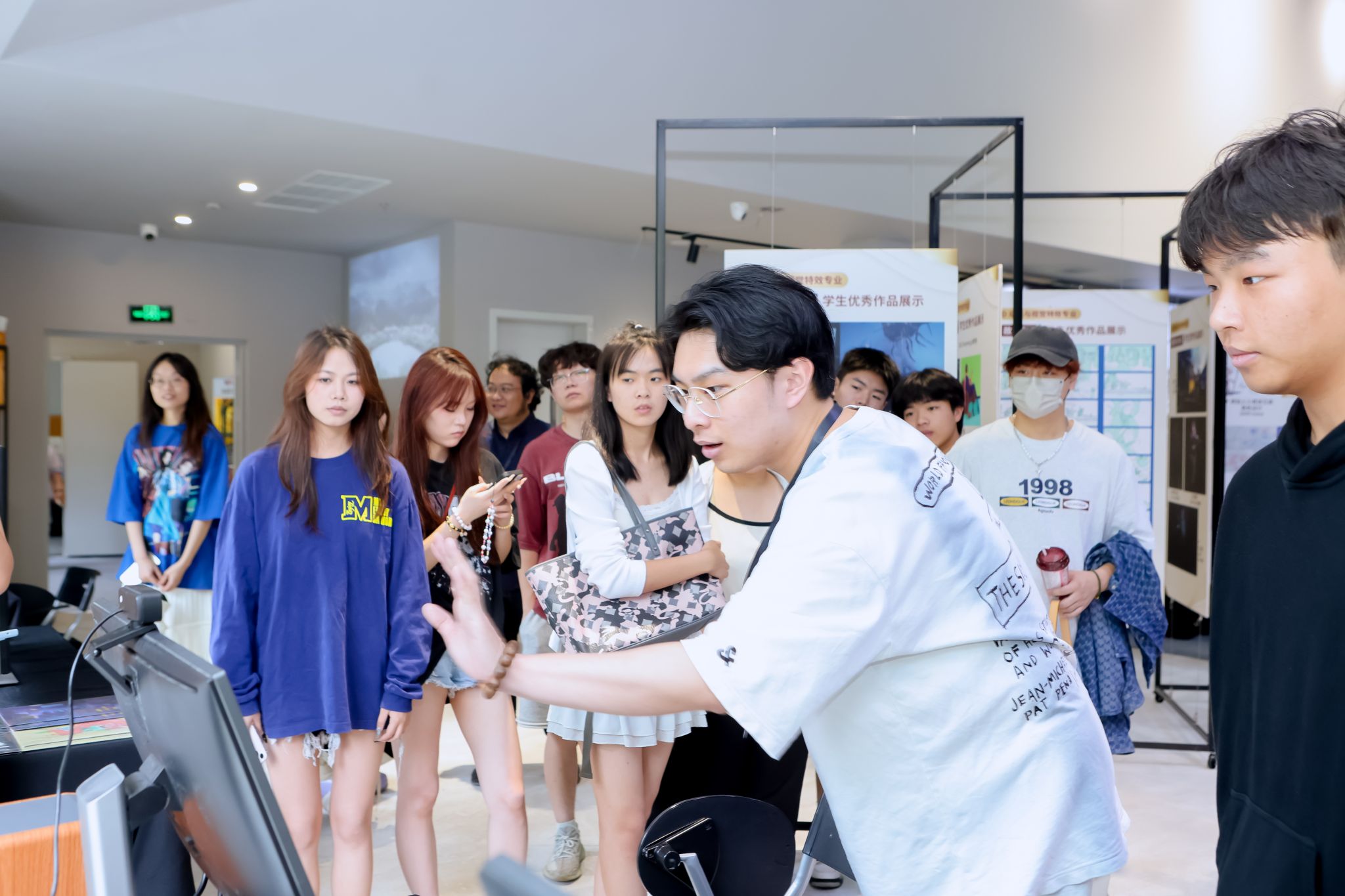 开幕式的尾声,参会领导、嘉宾一同参观了学院各大专业展区。各专业通过短片放映、表演剧场、数字交互、杜比全景声音频体验、特效造型还原、模型制作展示等形式,通过影像艺术、沉浸式戏剧演绎、数字媒体技术等方式极大地丰富了展演现场感官体验,展现出温影师生过往十年在影像艺术领域的独特见解和创造力。参观现场,大家纷纷驻足观看,共同感受师生的创作风貌。
